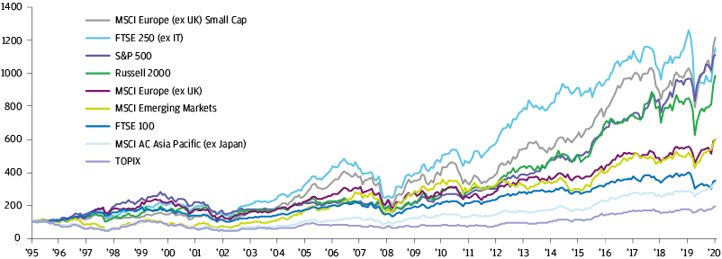 Source: J.P. Morgan Asset Management, Bloomberg. All series are rebased to 100 as at 31 October 1995 to 31 December 2020. All indices in GBP and include reinvested dividends. Indices do not include fees or operating expenses and are not available for actual investment. Past performance is not a reliable indicator of current and future results.
